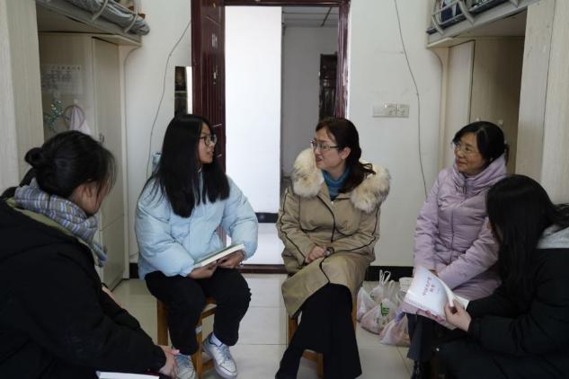随后代书记与寝室成员坐下亲切交谈,在融洽氛围中表达了关心与关注。在学习方面,代书记详细询问学生的期末复习情况,了解她们本学期在学习上的收获和感悟。大学将近过半,代书记还询问了关于考研和就业的想法,建议她们要慎重考虑和选择最适合自己的未来。寒假临近,代书记关心学生回家路上的安全问题。疫情影响情况下,她再三嘱咐学生回家和返校都要遵守疫情防控要求,注重防控,保证安全。最后,代书记勉励该寝室学生要认真准备期末复习,发扬优良学习风尚,继续努力,并表示期待之后收到她们的好消息。