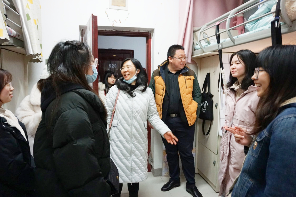 走访过程中,老师们与同学们进行亲切地交流,对大家在本学年取得的进步和荣誉到欣慰,鼓励他们再接再厉,来年再创辉煌。同时,刘亚兰希望大家把握难得的大学时光和机遇,充分地利用在校学习时间,学习贯彻十九届五中全会精神,增强自身的专业素养,利用好专业优势,为将来的实习和就业打好基础,为我国十四五建设做出力所能及的贡献。此外,刘亚兰强调同学们要注意寝室卫生、安全用电;期末临近,要好好调整心态,积极备考,争取取得好成绩;假期临近,要注意回家途中的安全,做好个人防疫措施。