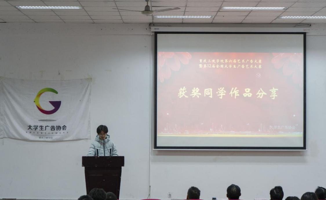 颁奖典礼伊始,大学生广告协会指导老师李佳蓉介绍了赛事评选基本情况。此次专业竞赛中,共收到参赛作品90余份,共评出15份获奖作品,其中在第12届全国大学生广告艺术大赛(重庆赛区)中,有3份作品获得了三等奖,7份作品获得了优秀奖。
