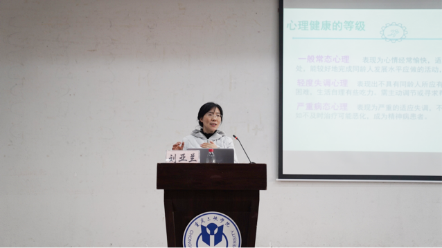 刘亚兰通过列举丰富生动的案例,分析大学生中常见的在自我评价偏差、情绪困扰、人际困扰、恋爱受挫、学习就业压力等方面出现的心理困惑或问题,引导大家识别抑郁等严重心理障碍,建议大家以积极阳光的心态应对学习生活中出现的问题和困难,学会自我调节,保持良好心态 。