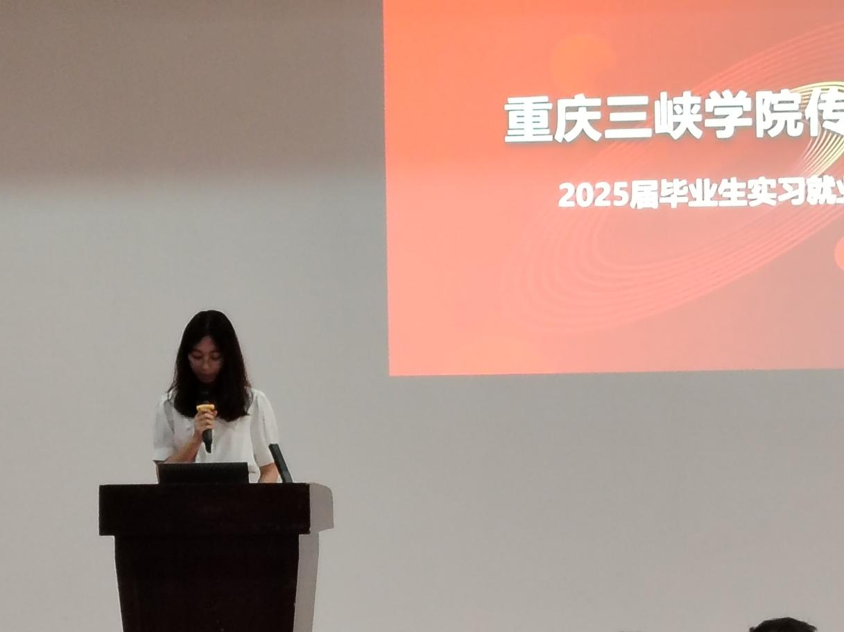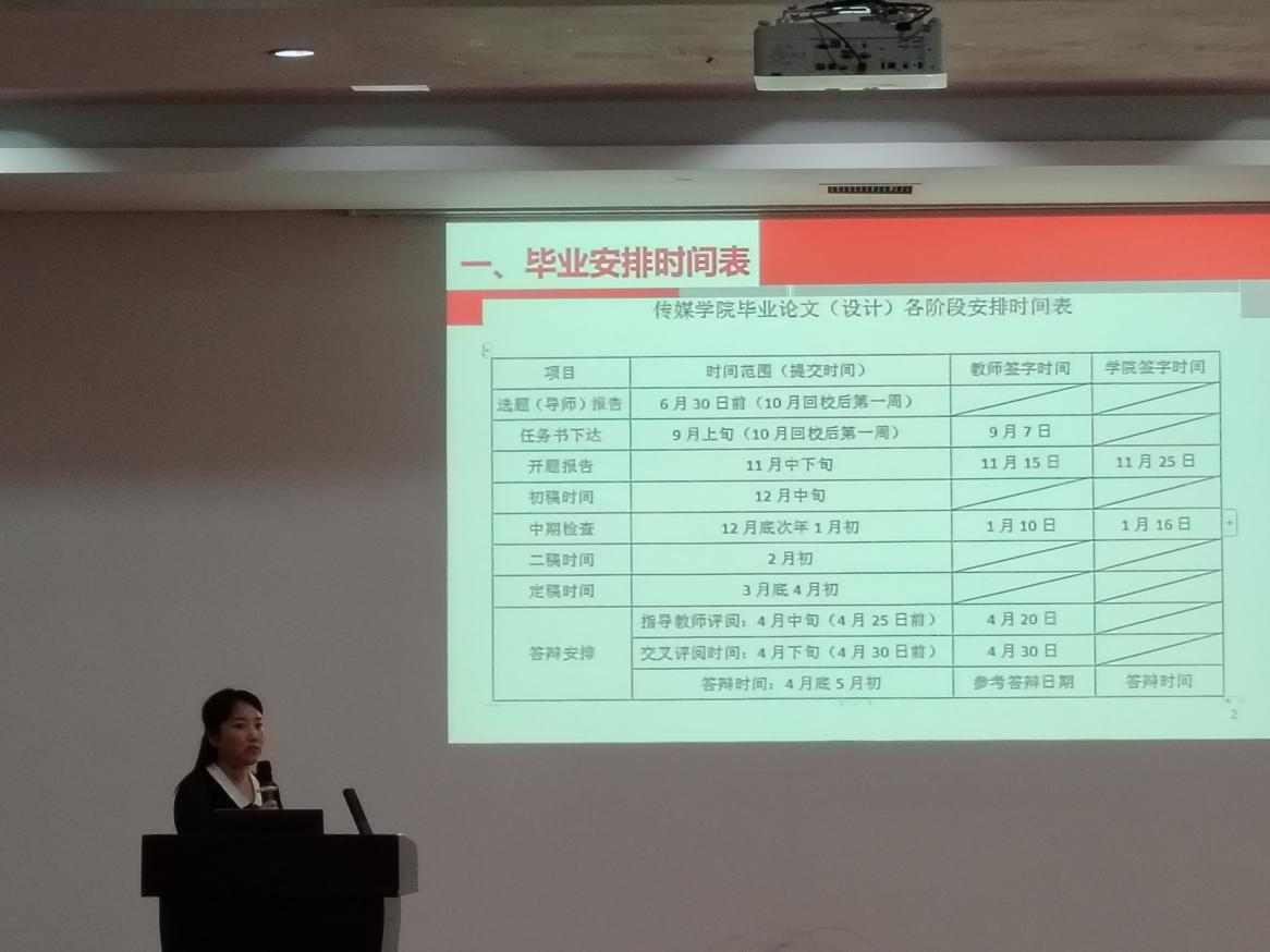 随后,网络与新媒体系主任史宗历对实习工作进行了详细的布置和安排,包括实习前的工作安排与准备、实习期间的表现以及成果转换、实习结束后的答辩评估等;广告系主任张春蕾则以关键时间节点以及应完成的任务为同学们将毕业论文(设计)的工作进行了详细解读、提醒;学工办副主任蒋静静解析了学院近五年的就业情况和学生就业调研情况,使得同学们对当下的就业形势有了更深刻的认识;来自2021级网络与新媒体1班的实习毕业生代表罗曼丹同学则立足当下,代表全体学生作出庄严承诺。