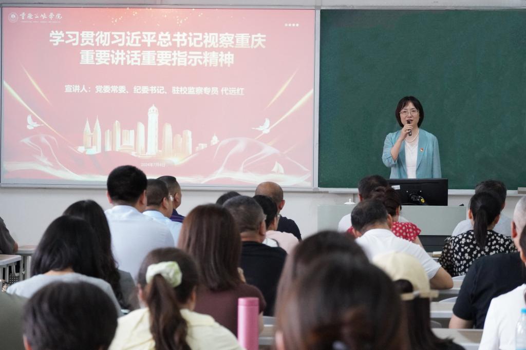 代远红指出,时隔五年,习近平总书记再次来渝考察,为新时代新征程新重庆建设把脉定向、擘画蓝图,令我们倍感振奋,深受鼓舞。党员干部要深入学习贯彻习近平总书记考察重庆重要讲话重要指示精神,结合正在开展的党纪学习教育,持续推动学深学透、求实求效。代远红强调,面对新形势、新任务、新挑战、新蓝图,党员干部要以更高站位、更大担当、更有力行动坚决扛起新的使命任务,要找准发展定位,谋划工作抓手,不断创新和提高学校事业的新质生产力,以感恩之心、奋进之志,积极推动学校实现高质量发展。