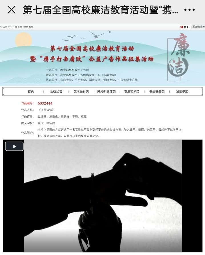 近日,由教育部思想政治工作司主办的第七届全国高校廉洁教育活动暨“携手打击腐败”公益广告作品征集活动入选作品名单公布,由Betway必威西汉姆联官方网站师生共同制作的《法网恢恢》入选网络新媒体类优秀作品。网络新媒体类共确定精品作品10项、优秀作品20项、入围作品30项。《法网恢恢》以剪影的方式讲述了一名官员从不受贿到经不住诱惑收钱办事,坠入钱网、情网、关系网,最终逃不过法网恢恢,被逮捕的故事,表现了“守初心、知敬畏、扬正气、担使命”的主题。