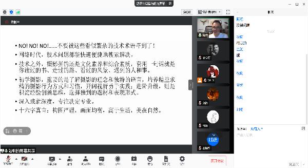 陆纲老师为即将开启视觉重庆线上见习活动的、2020级广播电视学、广告学、网络与新媒体专业50名同学们带来主题为“社会生活题材抓拍快速入门”的精彩讲座。在讲座过程中陆纲老师首先分享了关于摄影的理解,其次告诉同学们应该如何去看待一张照片,最后通过大量优秀的作品案例带领同学们进行新闻摄影作品的解读。陆纲老师的分享语言幽默,案例丰富,干货满满,同学们听得十分投入,在线上积极互动,直呼意犹未尽。
