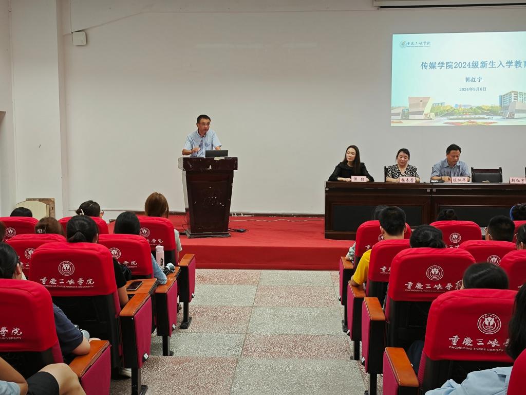 最后,学院院长韩红宇为新生全方位介绍学院的基本情况,主要包括学院概况、专业建设、师资队伍、大学生活等,以增强新生对自己所选专业的自信心,让同学们对Betway必威西汉姆联官方网站有一个清晰的认识。他表示,传媒行业是当今社会最具活力和影响力的领域之一,它不仅是信息的传播者,更是时代的记录者、文化的传承者和社会进步的推动者。作为未来的传媒人,应肩负起这份重要的使命。随后,韩红宇用四句寄语表达了对新生的希望和要求:一是要树立远大理想和目标,二是要适应新的学习生活环境,三是要学会自主自觉的学习方法,四是要注重培养创新精神和实践能力。他衷心希望同学们能正确认识历史使命和责任担当,树立远大的志向和抱负,努力成就更好的自己。