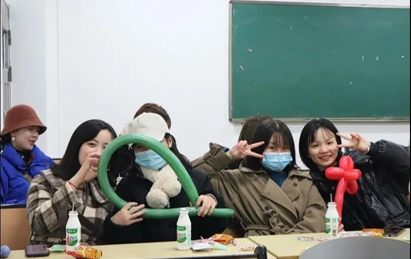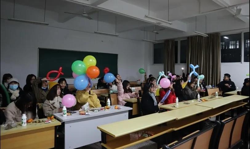 活动前,同学们一同从山顶散步,走向活动场地。一路上成群结队,秩序井然,充满欢笑。各色气球,各种口味的小零食、水果,让原本严肃的教室成为欢乐休闲的解压场所。活动中,大家痛快地吃喝,一起唱歌、玩游戏,各自吐槽生活的不如意,将烦恼与压力全部消化。