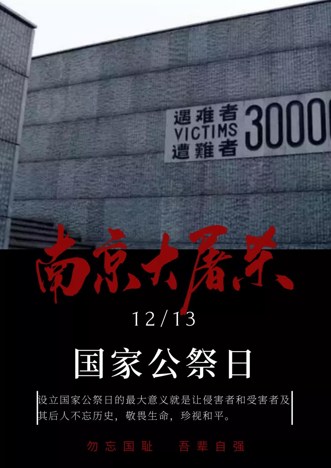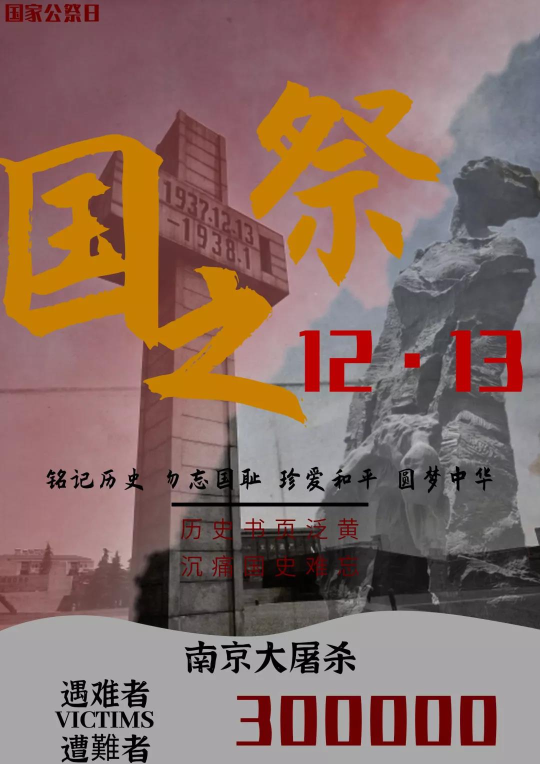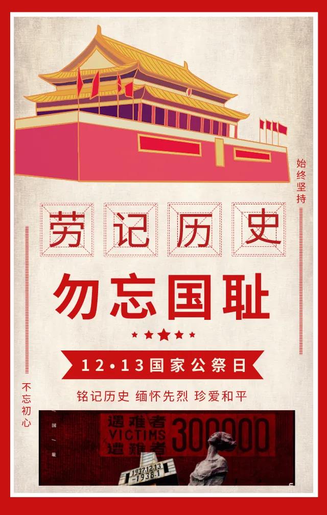 83年的今天,南京被攻陷,在此后的一个多月,血腥屠杀30余万中国人,制造了震惊中外的南京大屠杀事件。其滔天罪行,罄竹难书。今天,12月13日,是第七个“国家公祭日“,民族之殇,祭之以国,勿忘,勿忘!Betway必威西汉姆联官方网站铭记历史,珍爱和平,由团总支学生会各部门设计国家公祭日主题海报,哀悼逝者,不为延续仇恨,只为警醒,牢记历史,守望和平,吾辈当自强。