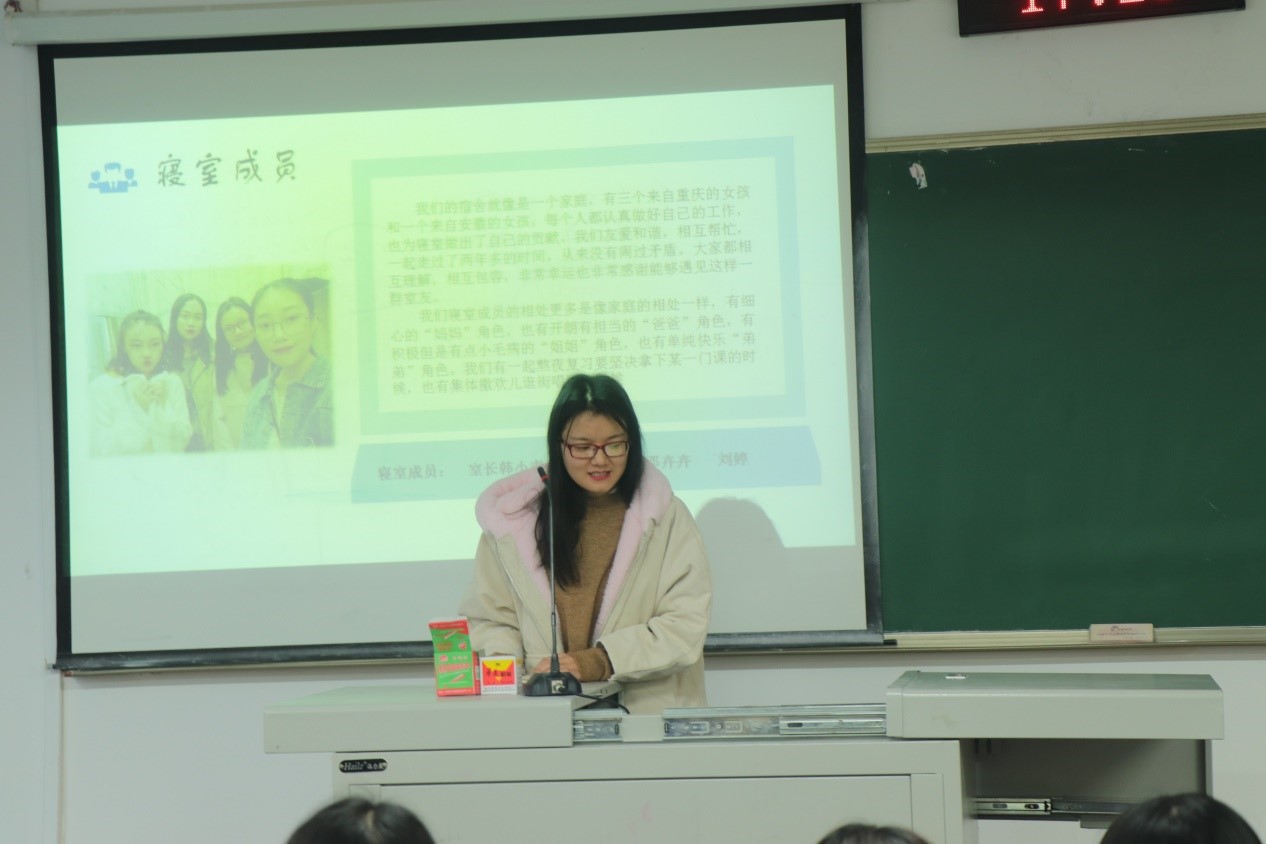 比赛开始,同学们掌声热烈,寝室主讲人热情饱满,落落大方地展现寝室学风的各个方面。每位主讲人逻辑清晰,从寝室卫生情况,寝室成员关系,寝室的学风情况以及寝室共同参加的活动等对寝室的学风进行了展示。第一个展示的是来自桂花苑1舍610的主讲人,她们从寝室氛围入手,讲诉了寝室良好的同学关系,活跃了现场的气氛。之后来自于桂花苑5舍513的主讲人讲诉了她们寝室的学习过程,让在场的同学连连佩服,不愧是学霸寝室。大多数寝室都展现了寝室的表彰情况,赢得同学们的一致掌声。