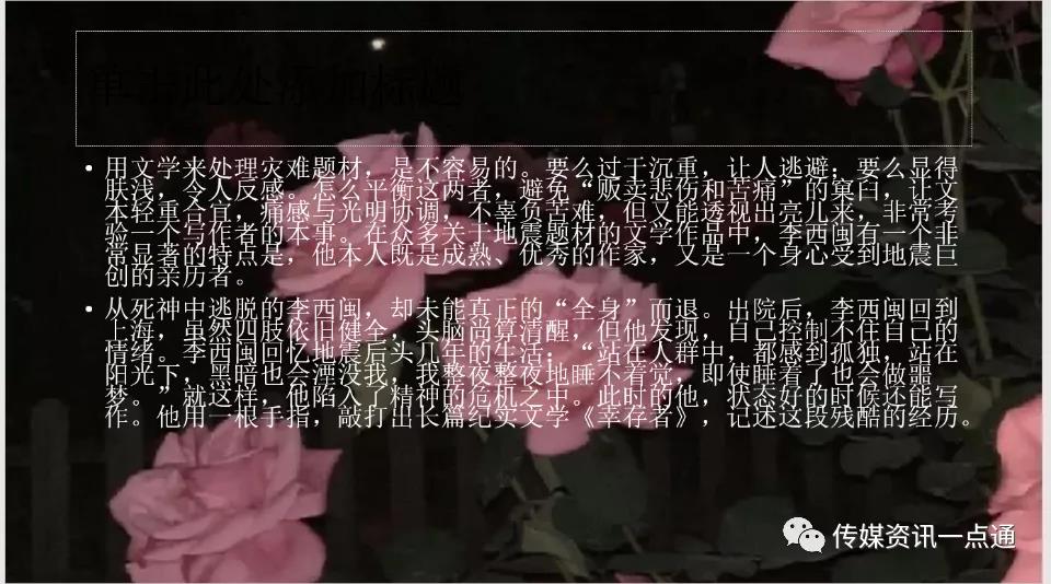 最后,罗雨同学给我们进行了分享:《幸存者》,“我是个幸存者,还幸福地活着的人,我仿佛没有权利忧伤。此时,我内心真的是如此的悲伤,如此的脆弱。人在精神上永远是孤独的旅者,没有同伴。”她采取PPT的形式为我们分享了这本书,她讲述了该作者的生平和写作的背景,然后阐述了她的希望与期盼。