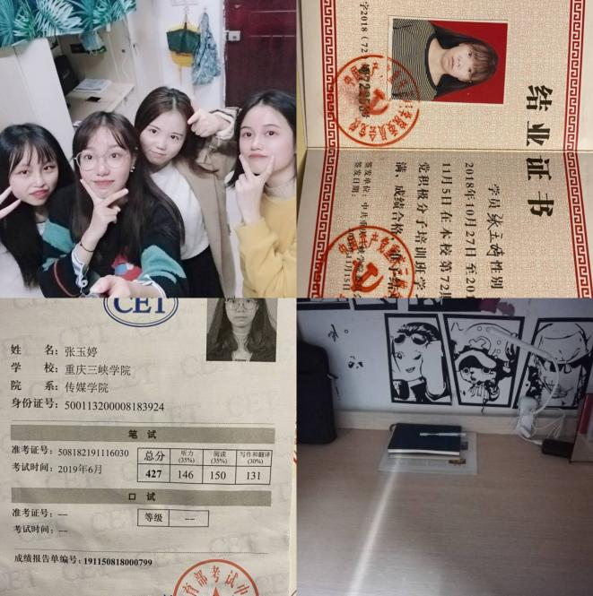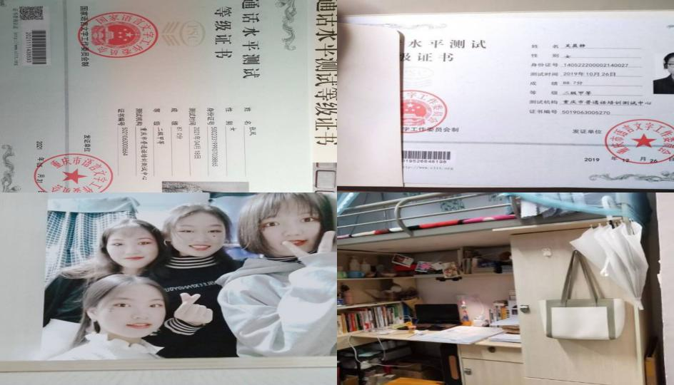 下面展示的是桂花苑1舍502宿舍,她们宿舍成员热爱生活,积极向上,成绩优异,全方面发展。下面是她们的自述:我们是热爱生活、积极向上、正能量满满的四人寝室。在大二上学期学习中两人获得三等奖学金,,四人四级全部过级,一人过了六级,学习氛围好,学习成绩优异。四个人都热爱体育锻炼,爱运动,身体素质好。不仅学习上相互进步,在生活上也互相关心,寝室关系和睦,经常一起聚餐、看电影追剧等等。赵家瑶同学是我们可爱有责任心的室长大人,在班上担任生活委员的职位,热爱劳动,关心集体,工作认真负责,经常会去慰问班上的同学最近的状况,给他们送去温暖。节假日也会和其他班委一起商量举办活动。张渝同学在新闻通讯社担任新闻部部长,多次撰写新闻稿,获得优秀编辑奖。平时性格开朗,是我们寝室的气氛调动者喜欢看吃播,尝各个地方的美食,是资深的一枚小吃货。李婷婷同学各方面都很出众,大事小事都喜欢找她帮忙,向她请教。学习成绩优异,有时间观念,喜欢乐于助人,热爱生活中可爱的事情,对新鲜的食事物保持热情。杜雯佳同学喜欢做志愿活动,志愿时长累计100多个小时。平时喜欢唠唠叨叨,看起来凶神不好惹,但是相处下来也有可爱的地方,喜欢吃甜食,吃不了辣,典型的假重庆人。