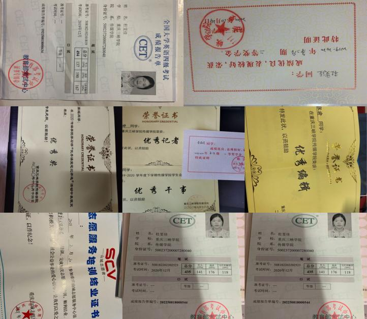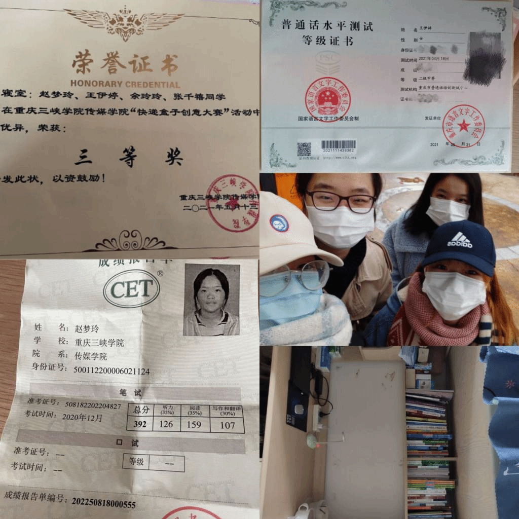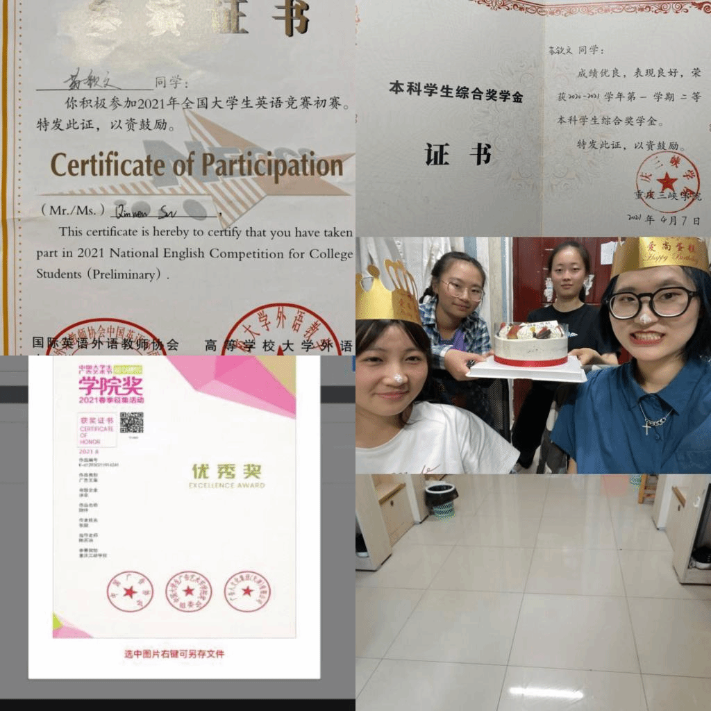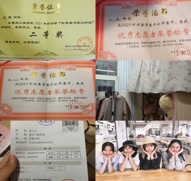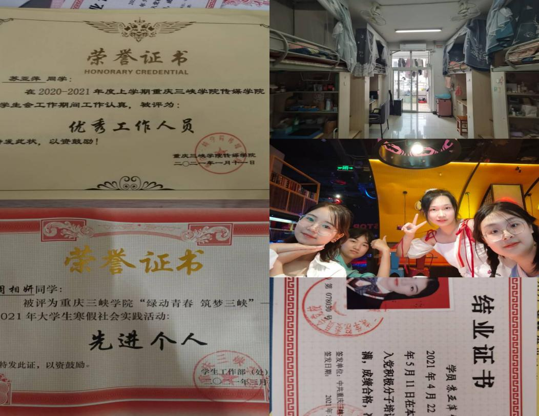 在学习上,在2020—2021学年下期,寝室成员绩点都超过3,平均绩点达到3.34,学习之余,我们积极参加万州消防公益赛,重庆市公益赛,全国大学生广告艺术大赛,和学院奖赛事。寝室成员吴晨静获得重庆市优秀学生干部称号,张凤获得校级优秀会长称号。目前,寝室有三名寝室成员积极准备考验,一名同学积极联系实习工作彼此走在遇见更好的路上。
