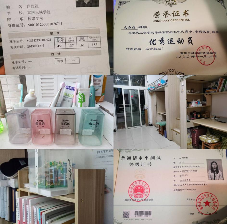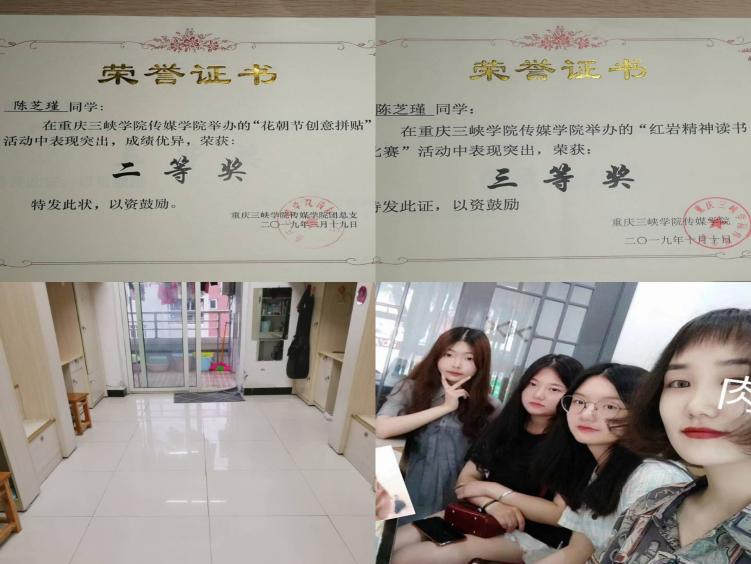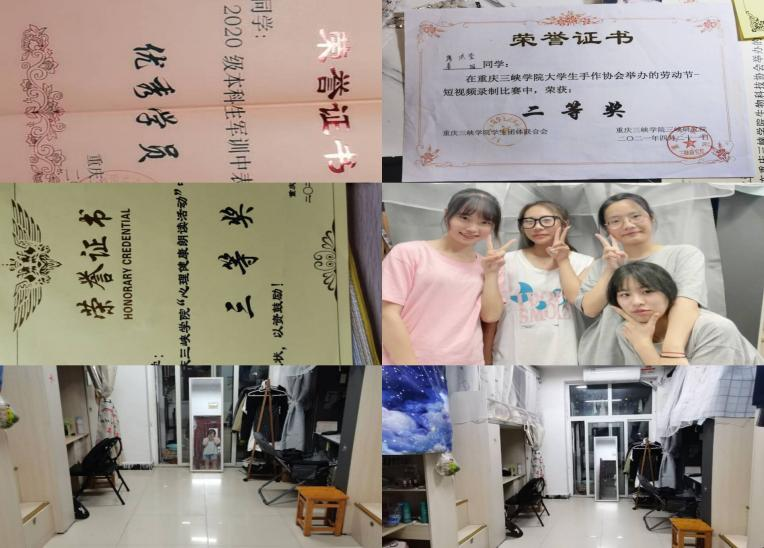 接下来展示的是桂花苑1舍506宿舍,该宿舍成员学习刻苦,团结友爱,积极向上,参与各种集体活动并获得奖项,下面是她们的自述:506寝室是由四个来自重庆的本地女生组成的。四个截然不同的女孩赋予了506不同的意义。热爱学习,热爱生活是我们的共同点。我们寝室,十分和谐的一大原因就是,我们都求同存异。每个人都有不同的性格,不同的生活习惯和不同的爱好。如何和谐地相处,尽量让每个人都保持本色的同时不发生矛盾和冲突在大学寝室其实不是那么容易。但是我们都做到了理解,包容,帮助,改变。我们共同养成了良好的生活习惯。并且,在各个方面百花齐放的同时培养了共同的爱好,这也让我们更好的打成一片,生活乐趣多多。