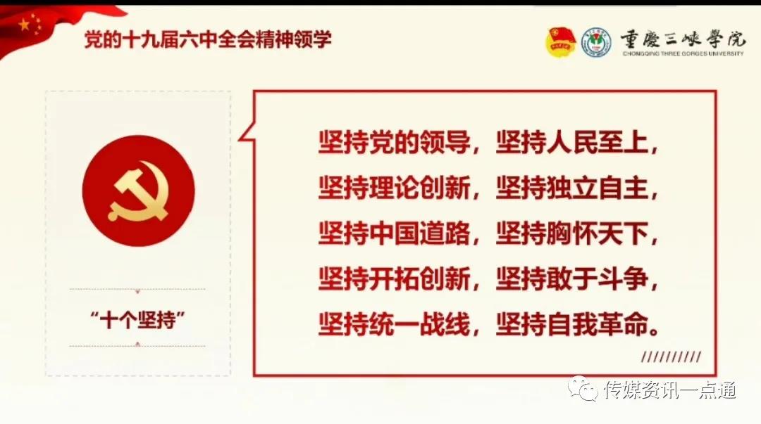 此次宣讲会一共包含九个大要点,分别为:全会最重要的成果是审议通过了《中共中央关于党的百年奋斗重大成就和历史经验的决议》、全会强调"两个确立",对新时代党和国家事业发展,对推进中华民族伟大复兴历史进程具有决定性意义、进一步概括习近平新时代中国特色社会主义思想的核心内容、全会审议通过的《决议》是党的历史上第三个历史决议、以"十个坚持"总结党百年奋斗的历史经验、文化建设取得重大历史性成就、我国全过程人民民主"民主含量高,民主成色足"以及“在高质量发展中推动共同裕”和“创建经济快速发展奇迹的"秘决"。