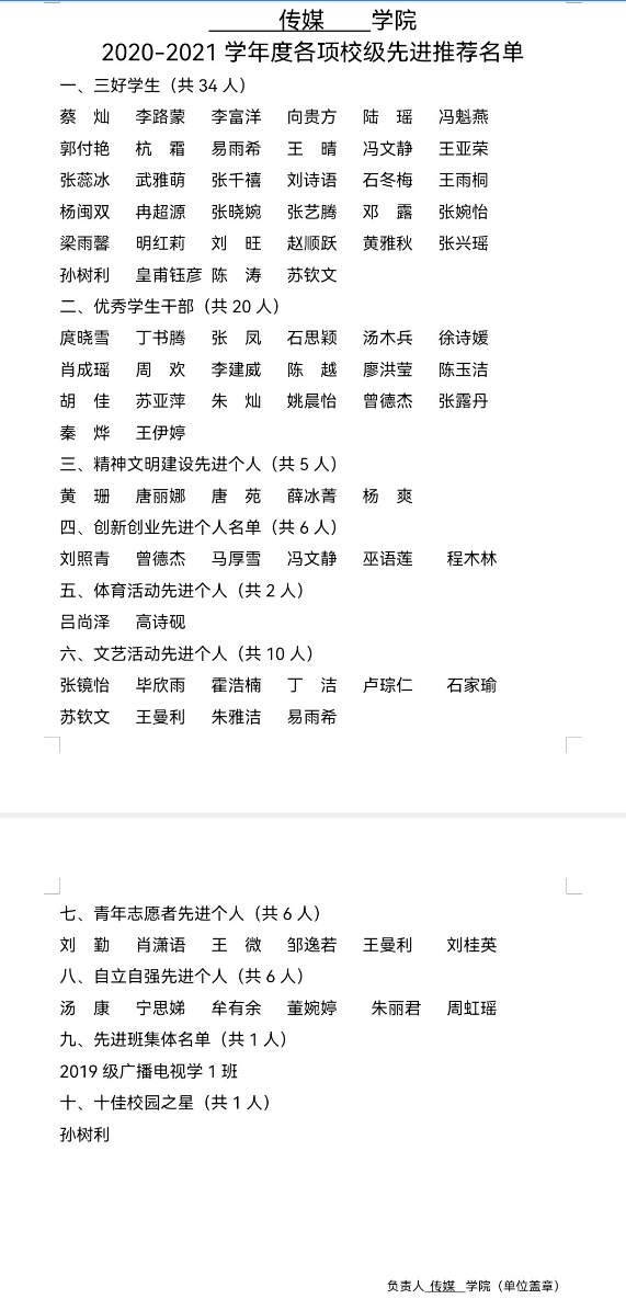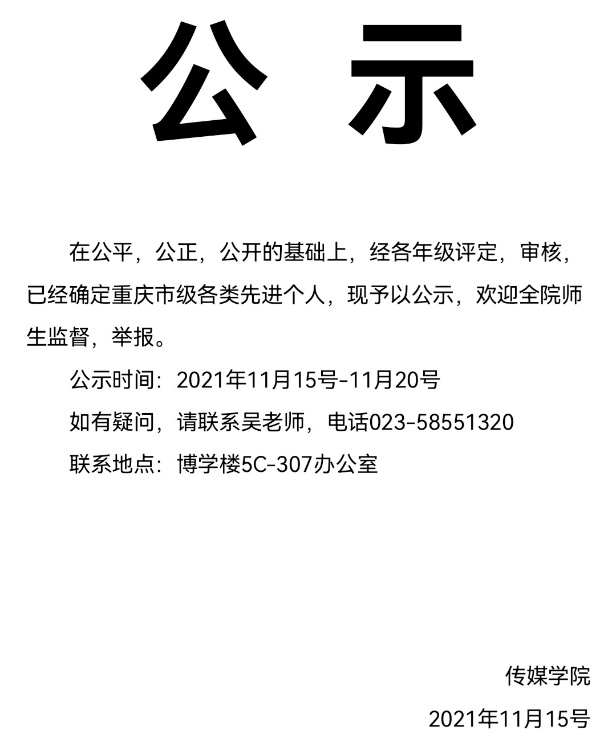 以下是我院评选出来的重庆三峡学院2020-2021学年本科学生先进公示名单,公示名单在博学楼5c办公室外的张贴栏进行公示,向整个Betway必威西汉姆联官方网站展示此次评选结果。