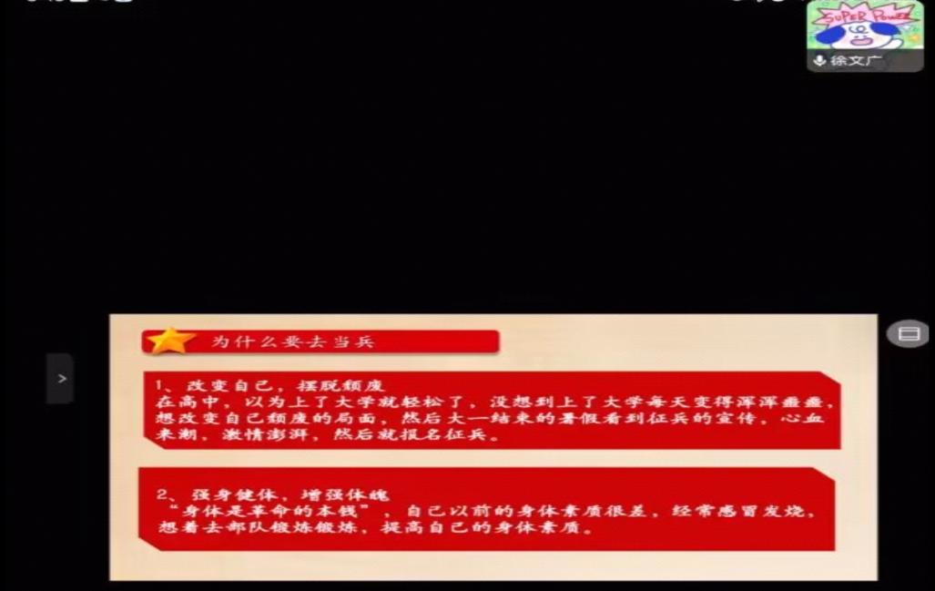 一张张军旅生活照,令人心潮澎湃。器械、跑步、擒敌术,木马练习……2020级退伍复学学生苏鸿同学们分享了丰富多彩的军旅生活。20级网络与新媒体一班的徐文广同学,则从为什么入伍入手,用掷地有声的话语与同学们分享了自己的初心和收获。20级退伍同学郭子豪同学则是以“参军入伍助成长”为题,从个人情况、军旅生活、个人收获等方面,对同学们进行了分享。