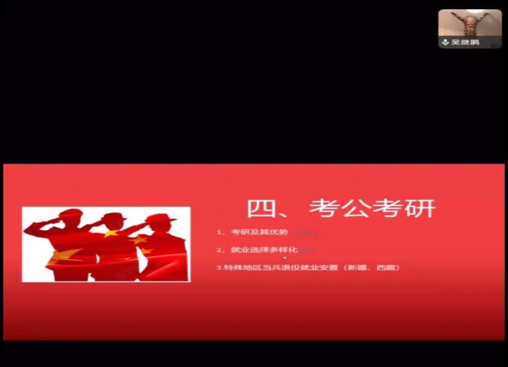 “大学生参军入伍,可以享受考研加分,毕业后考研还可以参加退役大学生士兵专项考研计划,我就是通过这个专项计划考入咱们学校的。”来自电信学院的代理辅导员陈杰结合自己考研经历,介绍征兵入伍考研方面的优待政策。