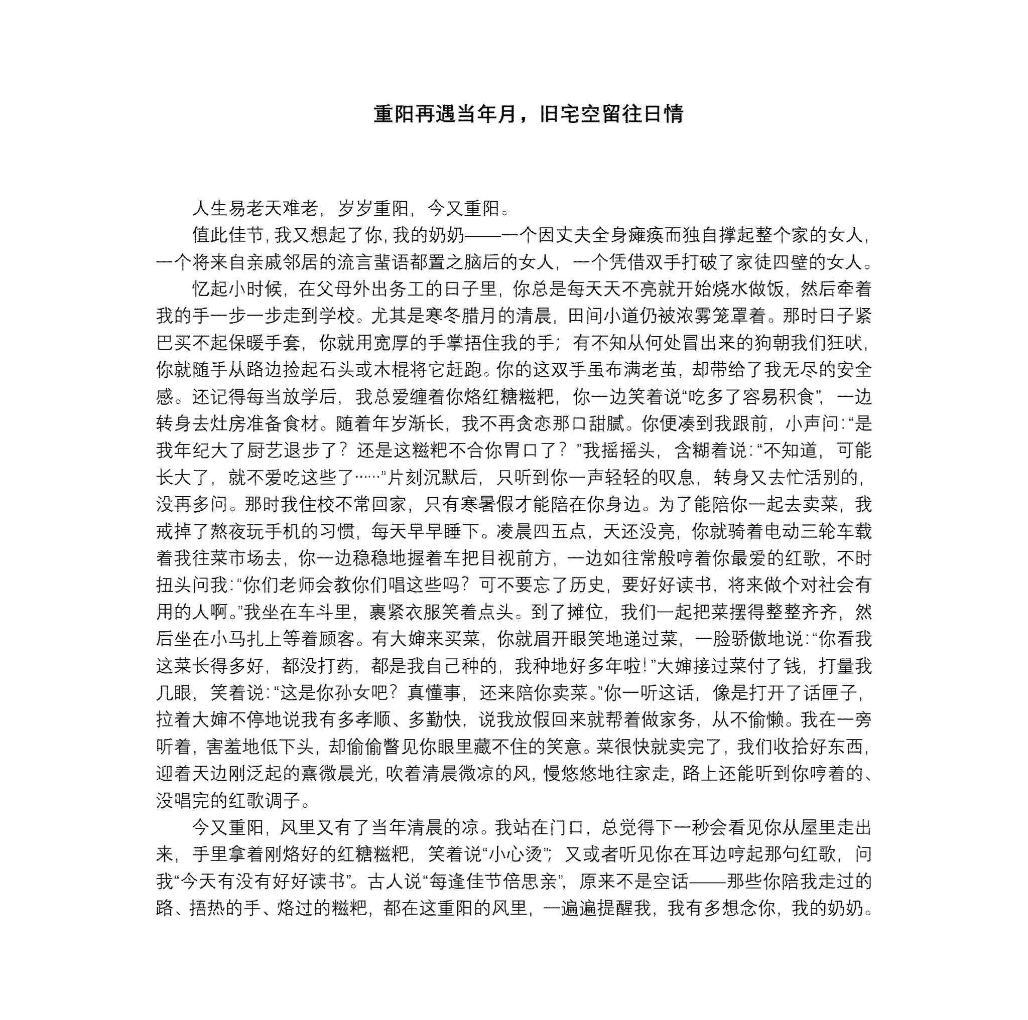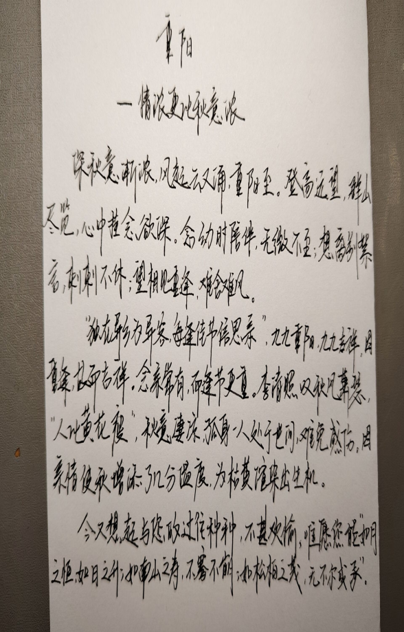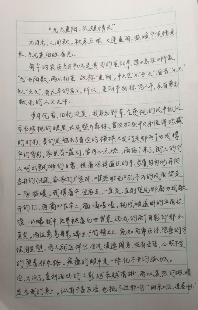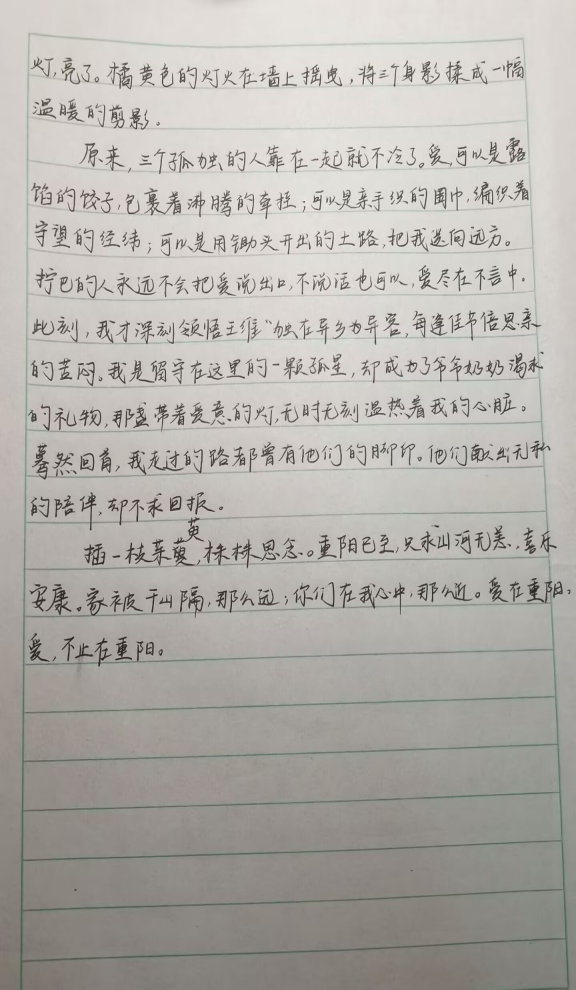 投稿作品情感真挚、形式多样。其中既有诗歌《重阳——情浓更比秋意浓》以古今对话表达敬老之情,也有朴实语言写就的家常牵挂,更有长信追忆已故亲人,于细腻叙述中传递深切思念。作品语言平实而贴近生活,共同呈现了属于一个家庭的温情历史。